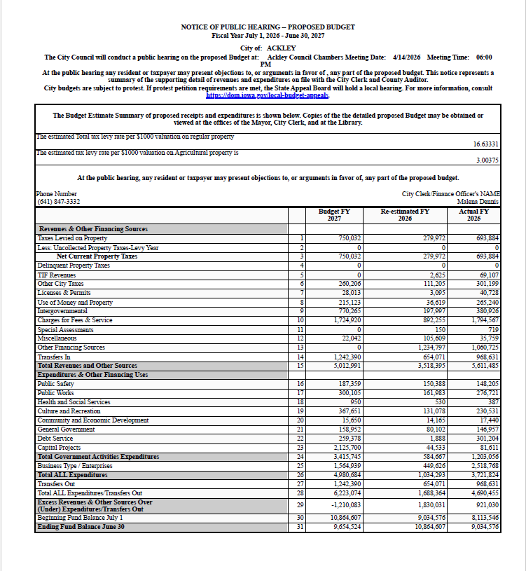 NOTICE OF PUBLIC HEARING | Proposed Budget | April 14, 2026 | 6:00 pm